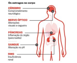 - Entre 6 e 24 horas: visão turva, sensibilidade à luz, perda da percepção das cores, convulsões e coma;