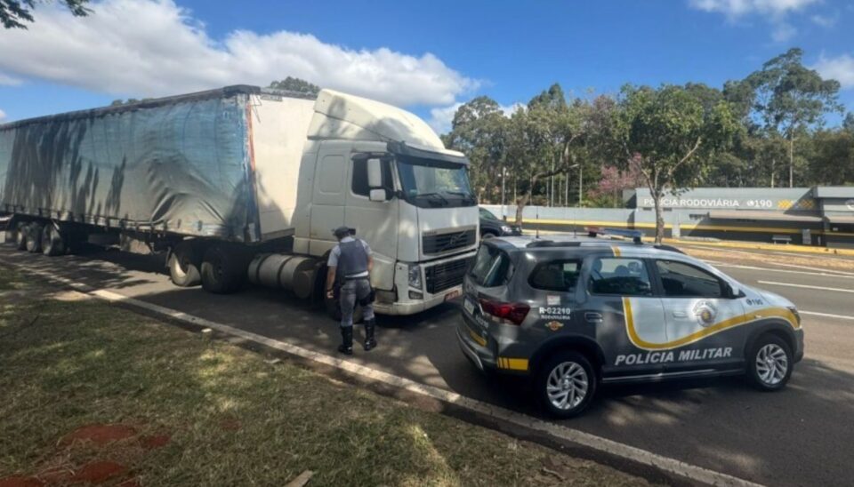Policiais abordaram o veículo, que tracionava um semirreboque, ambos com placas de Poços de Caldas (MG). Após fiscalização detalhada, foi constatado que o caminhão possuía 52 registros de evasão de pedágio e cerca de 40 infrações de trânsito acumuladas.