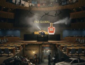 ​E quando a situação interna se torna insustentável, apela-se para a diplomacia da perfumaria. O figurino é impecável para o palanque da ONU. Lá, entre apertos de mão e resoluções vazias, o Brasil se apresenta como o pacificador do mundo. Borrifa-se uma fragrância de “protagonismo global” para mascarar o cheiro de pólvora que impregna o dia a dia de nossas capitais. É o síndico que quer mediar a paz no Oriente Médio enquanto o seu próprio prédio é governado por facções e o telhado desaba sobre os inquilinos.