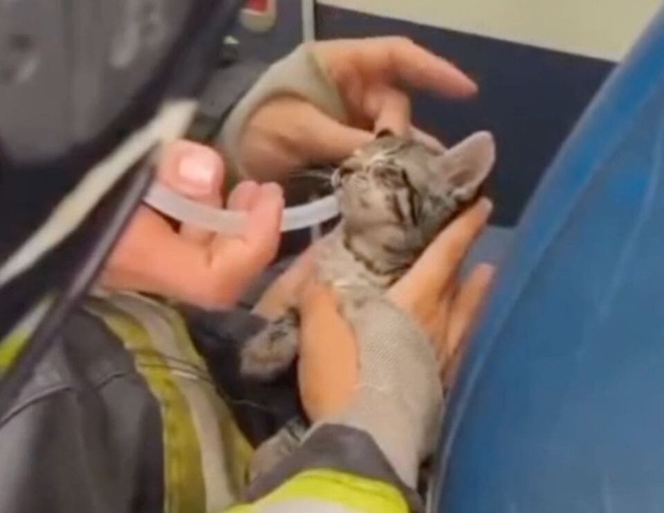 Durante o atendimento da ocorrência e após o combate às chamas, os bombeiros realizaram a vistoria de segurança no local, quando localizaram o animal em estado grave. O gatinho apresentava sinais severos de inalação de fumaça, estava hipoativo, com respiração ofegante e acelerada, além de apresentar espuma na boca, indicando comprometimento respiratório.