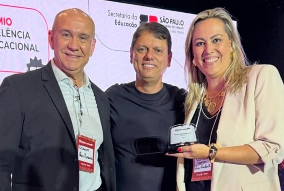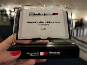 A premiação foi recebida pela secretária municipal de Educação, Karina Gomes, e pelo vice-prefeito, José Osanam, das mãos do governador Tarcísio de Freitas. O reconhecimento integra o programa Alfabetiza Juntos SP, uma das principais políticas públicas voltadas à alfabetização no Estado.