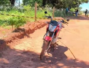A moto utilizada pela vítima foi encontrada abandonada na estrada rural em frente à propriedade. Foto: Panorama Notícia