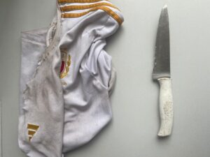 A Polícia Militar foi acionada e, com base em descrições e imagens de câmeras de segurança, iniciou buscas pela região. No cruzamento da Rua Mendes de Moraes com a Avenida Tancredo Neves, na área da linha férrea, os policiais viram um homem tentando se desfazer de uma camiseta branca e de uma faca. Ele tentou fugir, mas foi capturado.