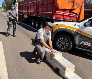 A Polícia Militar Rodoviária realizou, na tarde desta terça-feira (25), uma das maiores apreensões de drogas do mês na região de Presidente Prudente. Durante fiscalização de rotina na Rodovia Raposo Tavares (SP-270), no km 56, equipes do 2º BPRv, com apoio do TOR (Tático Ostensivo Rodoviário) e do Canil do 8º BAEP, localizaram 102,8 quilos de maconha escondidos no interior de um caminhão com placas do Paraguai e prenderam o condutor.