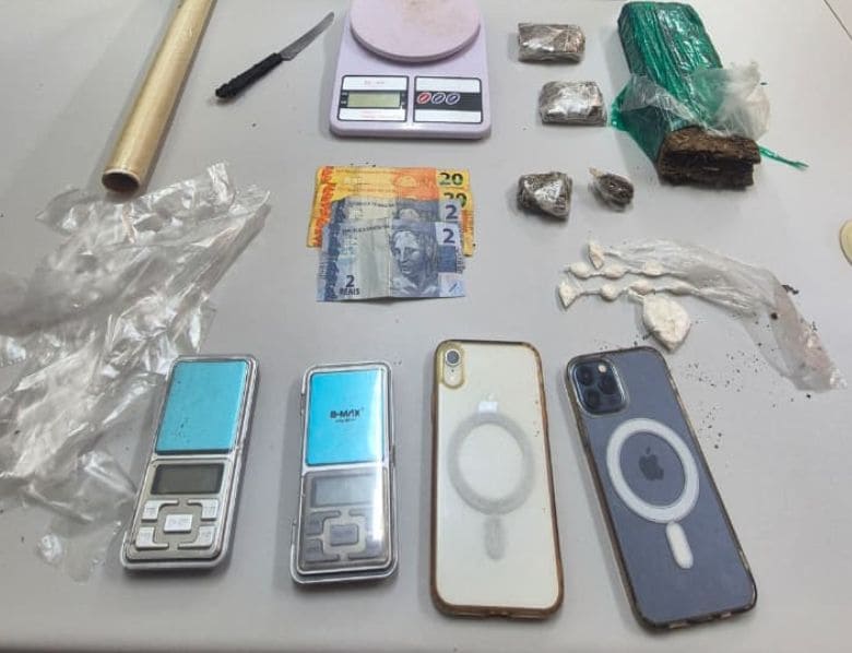 Em um dos imóveis vistoriados, os policiais encontraram e apreenderam várias porções de maconha e cocaína, além de balanças de precisão, utensílios utilizados para fracionamento e embalagem de entorpecentes e aparelhos celulares.
