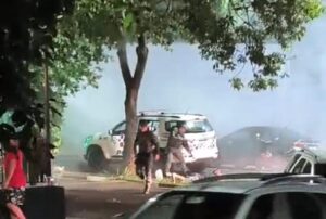 Dessa vez, os policiais encontraram aproximadamente 150 pessoas reunidas entre carros e motos, bloqueando a via. Durante a intervenção, parte dos presentes começou a arremessar garrafas contra as viaturas, atingindo uma delas, pertencente à Força Tática. Nenhum dano foi registrado, mas a situação exigiu reforço.