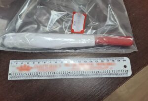 Conforme relato policial, ao saber que a polícia militar seria acionada, a estudante entregou a faca à diretora da unidade escolar. O objeto — uma faca de cozinha serrilhada, com cabo vermelho — foi posteriormente apresentado no 6º Distrito Policial por um cabo da Polícia Militar e apreendido.