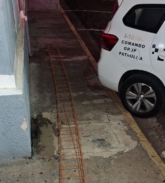 Questionado, o homem confessou que havia retirado o material de uma obra nas proximidades. Ele foi conduzido ao Plantão da Polícia Civil, sem necessidade do uso de algemas. O engenheiro civil responsável pela obra compareceu à delegacia e reconheceu o objeto como sendo pertencente ao local. O material, composto por quatro barras de ferro (vergalhões), foi apreendido.