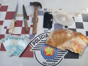 Durante a revista, os policiais encontraram uma porção de cocaína, R$ 1.840 em dinheiro, duas facas, um martelo e um aparelho celular. Ao ser informado de que seria levado ao Distrito Policial, o motorista tentou fugir, sendo necessário o uso de força física para contê-lo e algemá-lo.