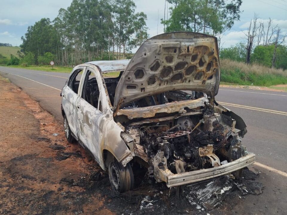 Um carro ficou completamente destruído após pegar fogo, na manhã desta quinta-feira (13), na Rodovia Ângelo Rena, em Regente Feijó (SP). O incidente ocorreu por volta das 8h40, no trecho que liga o município a Presidente Prudente (SP).