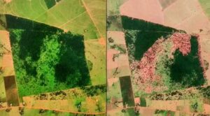 Equipes da Polícia Militar Ambiental, com apoio do helicóptero Águia da Polícia Militar, flagraram a degradação ambiental em uma propriedade rural no município de Rosana (SP). No local, uma máquina retroescavadeira foi surpreendida realizando a retirada de vegetação nativa.