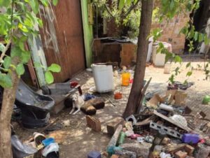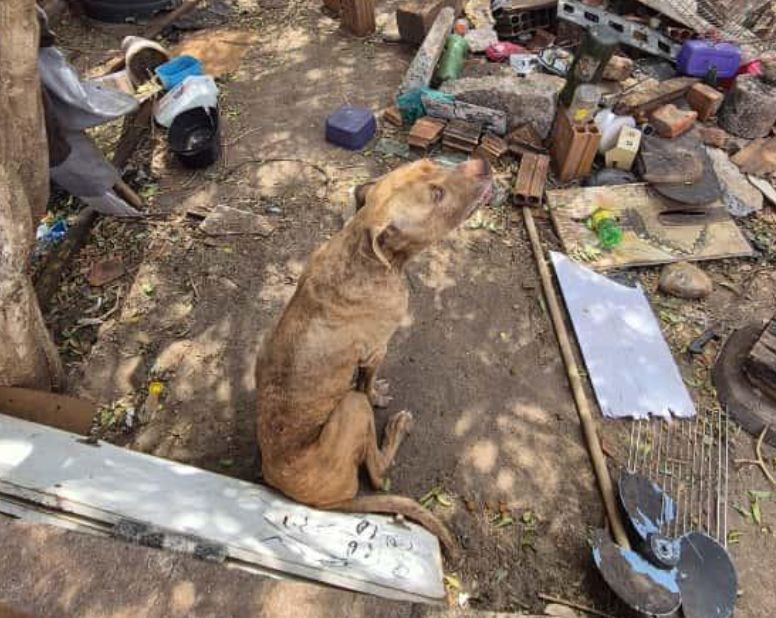 No quintal da casa, um cão de pelagem amarela, possivelmente da raça pitbull, estava em estado de magreza extrema, com ferimentos pelo corpo e sinais de idade avançada. Ao lado dele, outro cão, de pelagem branca e sem raça definida, demonstrava medo e comportamento arredio.
